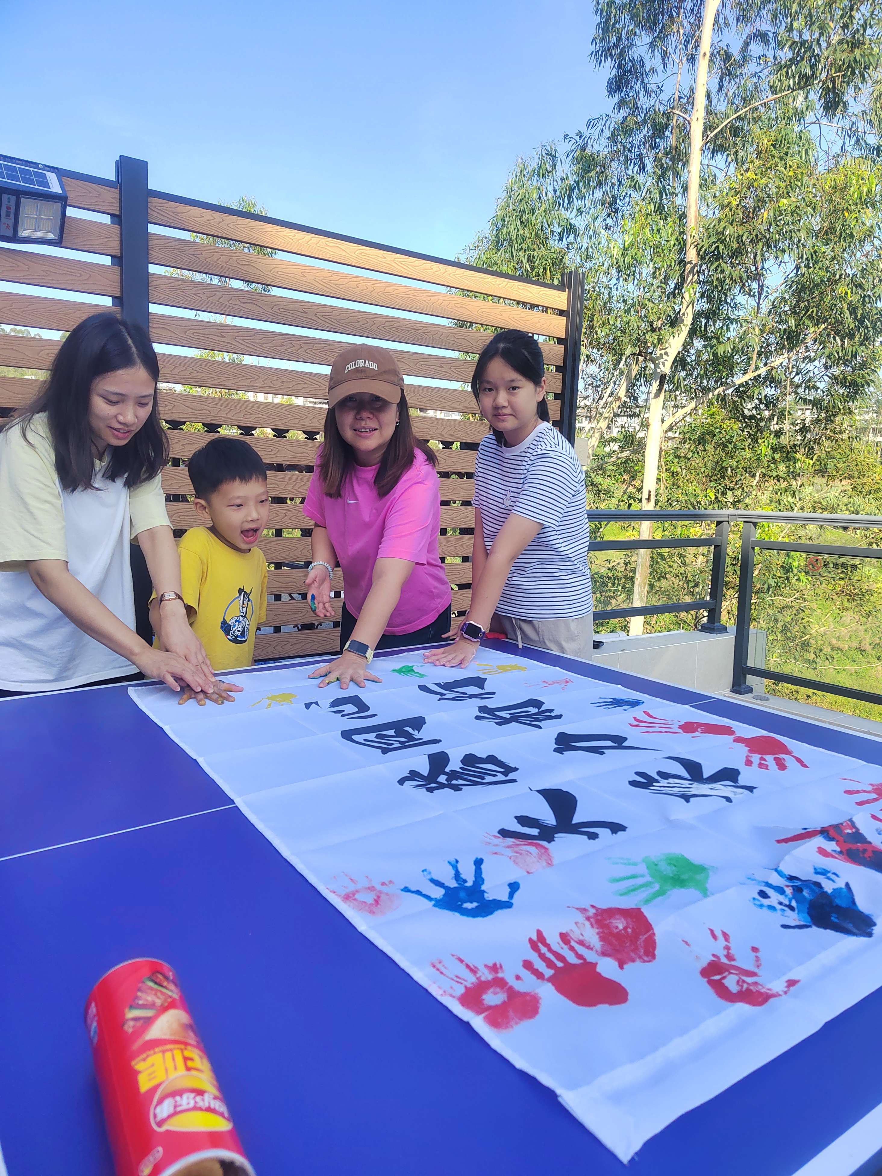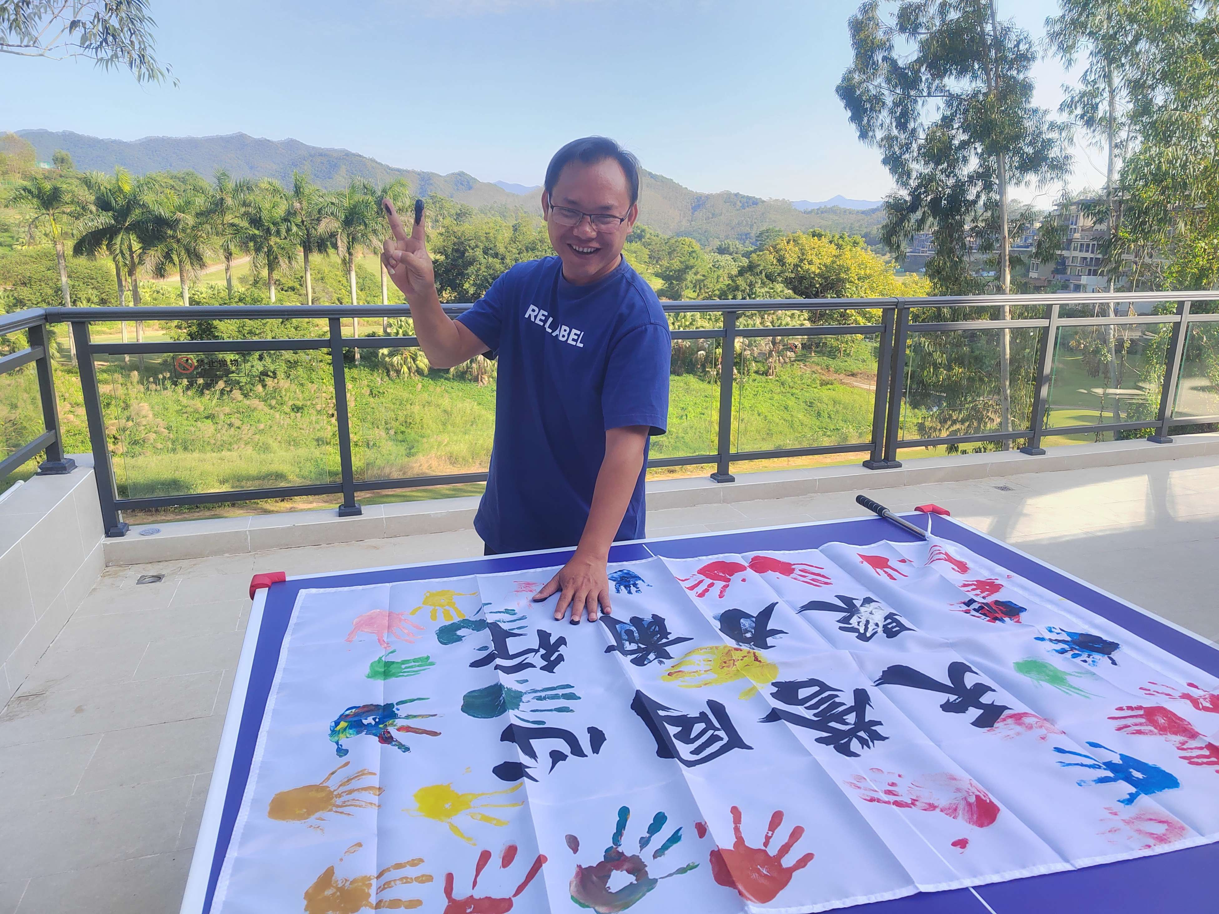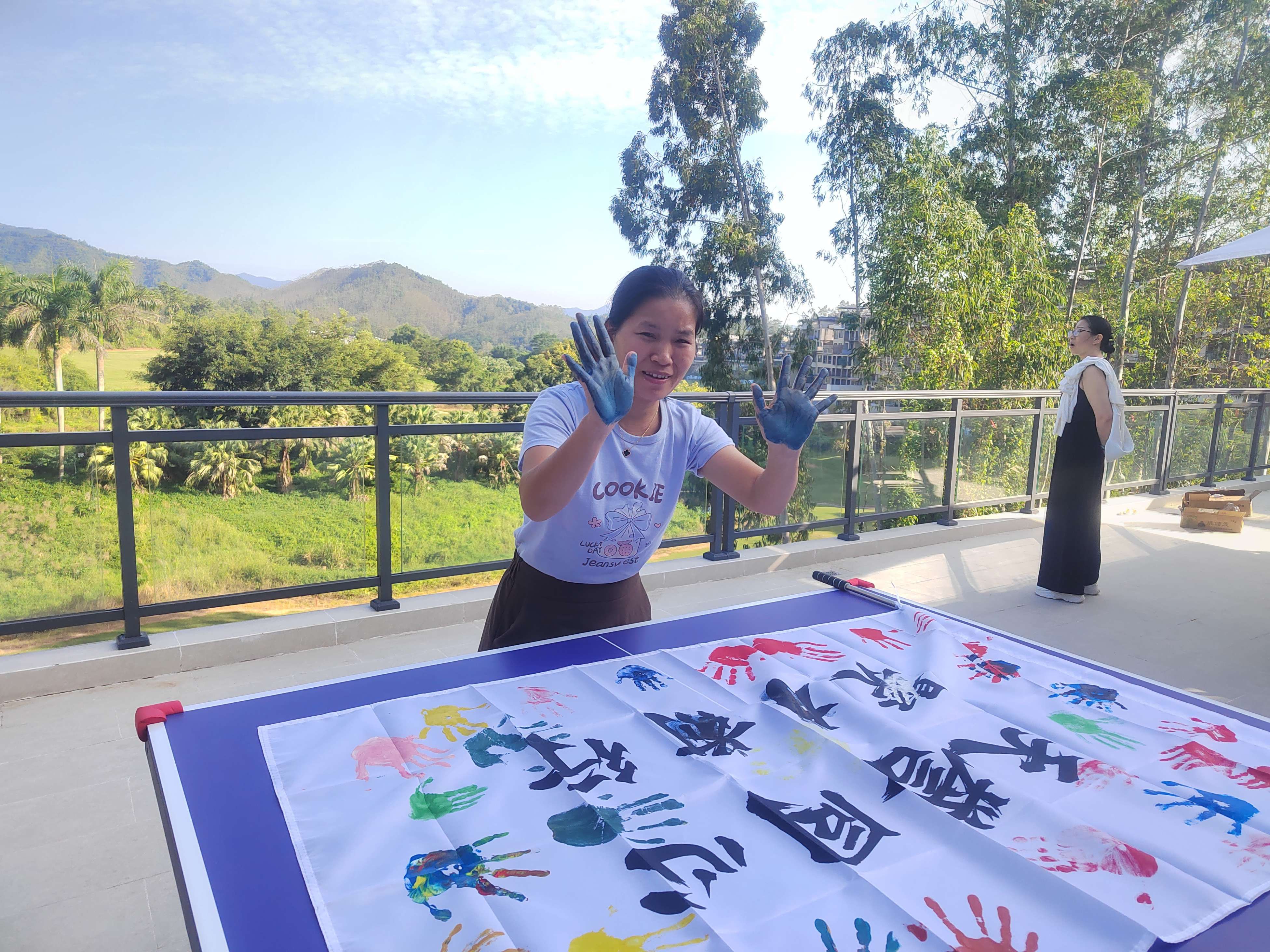 26日下午,活动进入温馨而富有仪式感的环节。全体成员在印有“暂别工作岗位,奔赴山海快乐”的横幅下拍摄了洋溢着灿烂笑容的大合照。随后,大家在公司精心准备的纪念旗上,郑重按下五彩手印。旗面上“天誉同心,聚力前行”的标语与每一个独特的手印交织在一起,象征着天誉环保团队力量的汇聚与融合,成为此次团建最珍贵的纪念。